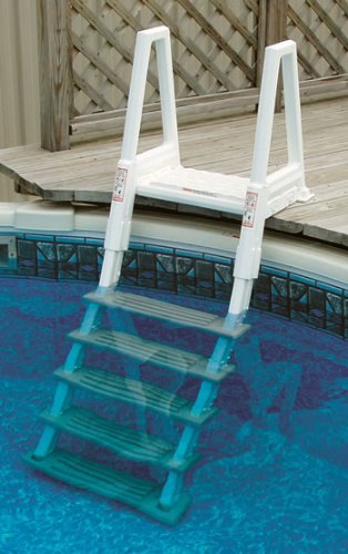 6000B Features: -Ladder. -Flat treads for easier climbing. -Includes deck platform. -No sand required. -Anti-entrapment barrier. -White side rails with grey trends for high visibility. -Deluxe heavy-duty in-pool ladder. Specifications: -Weight guidelines: 300 lbs. -Totally adjustable for deck heights from 46" to 56". -Treads measure 5" x 18" Wide.